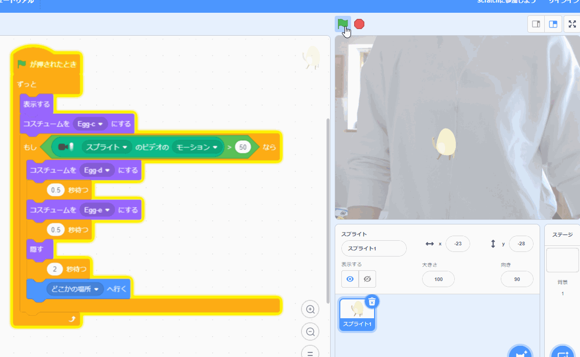 Scratchの拡張機能「ビデオモーションセンサー」を使ったたまごわりゲームのレシピです🐣