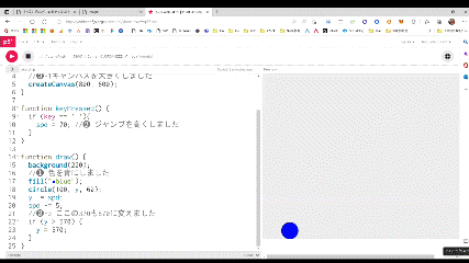 ゲームでは「〇〇キーを押すと△△がおきる」みたいなのがよくありますよね。前回は図形が自動的に動き回りましたが、今回は「スペースキーを押すと図形がジャンプする」というのをやってみます。