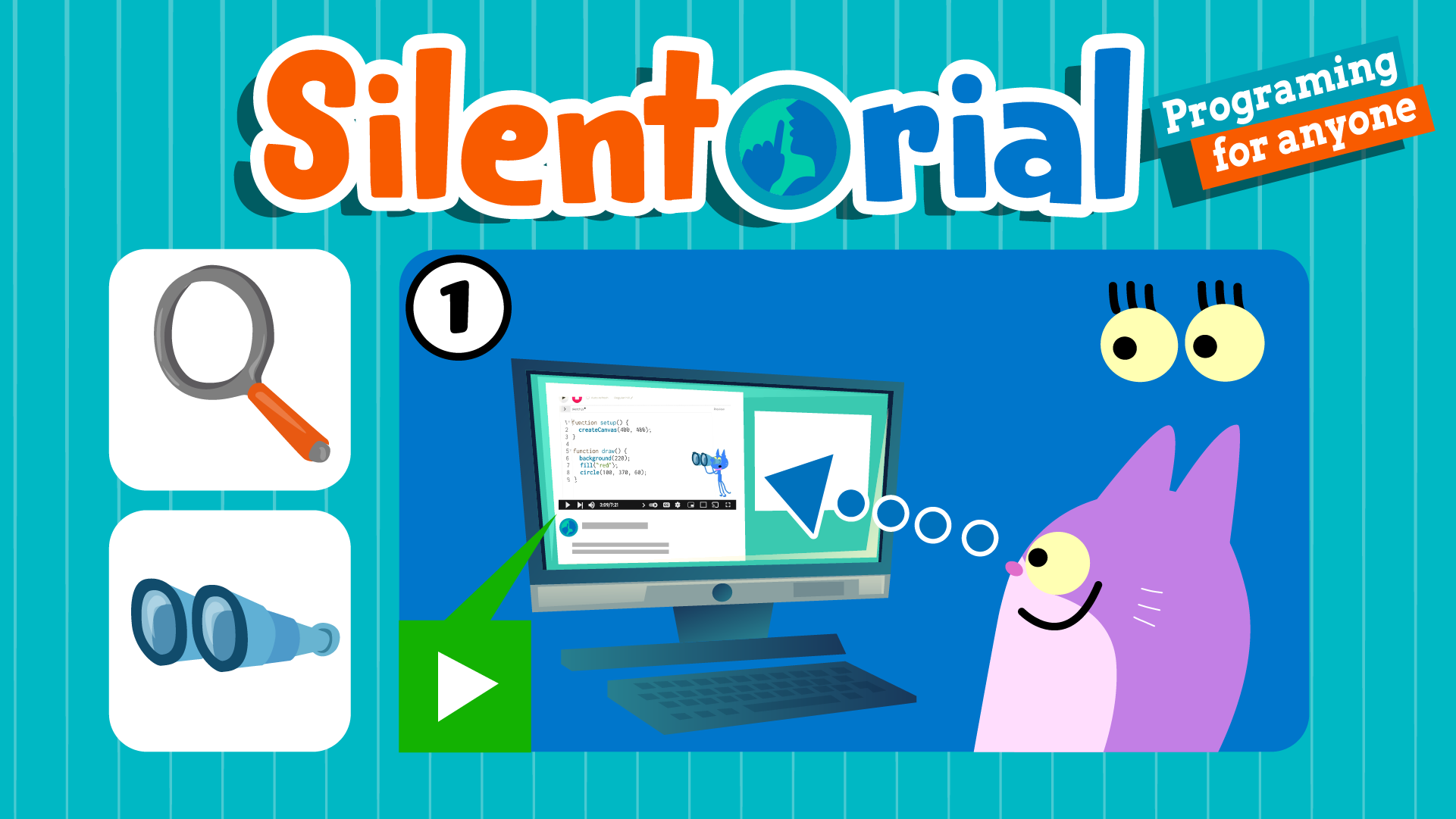 ネコの「ファジーパンツ」が双眼鏡や虫めがねを持っているときは、画面をじっくり見てください。どんなプログラミングコードを書いているか、しっかり観察します!