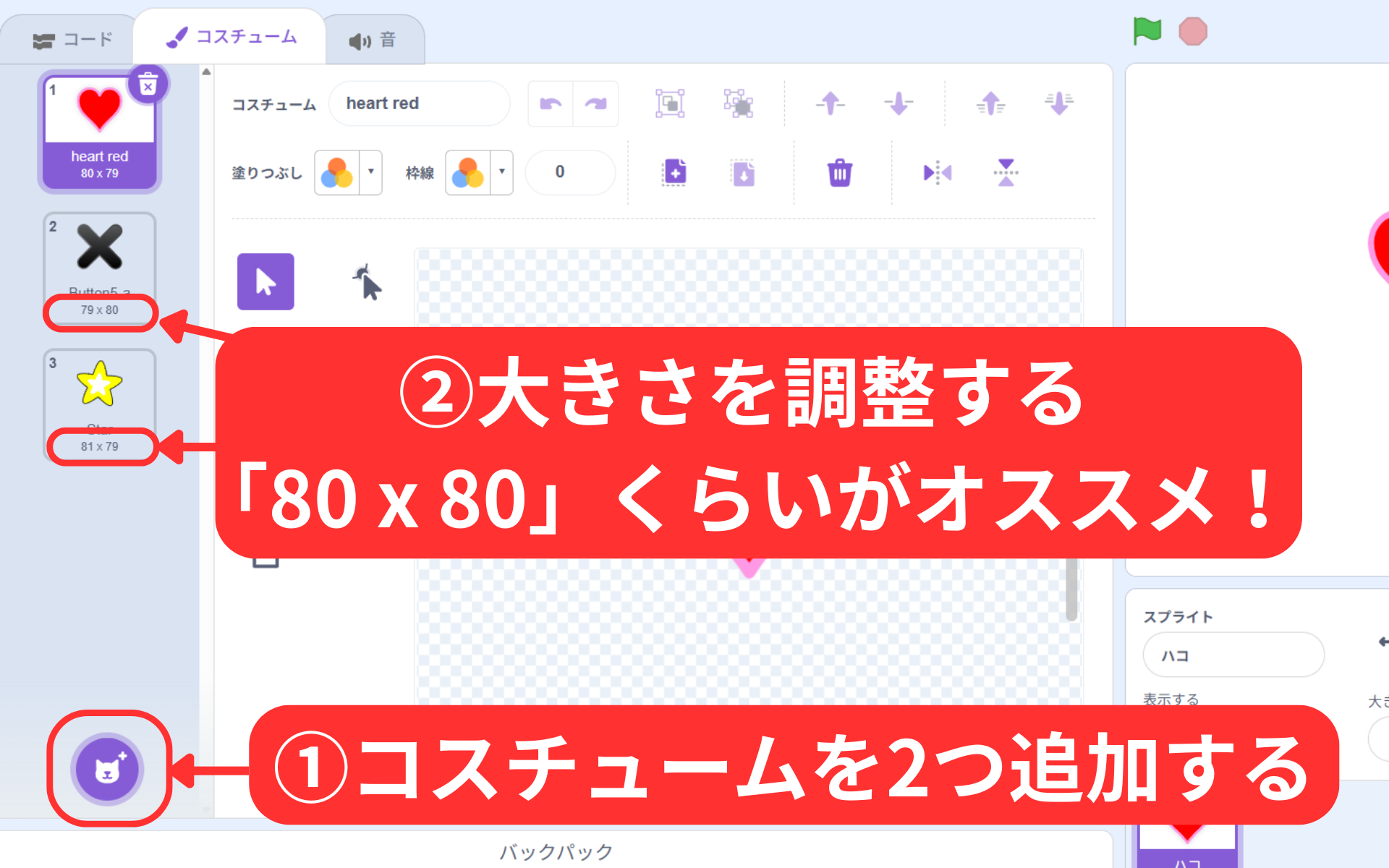 あと2つコスチュームを追加し、大きさと位置を調整します