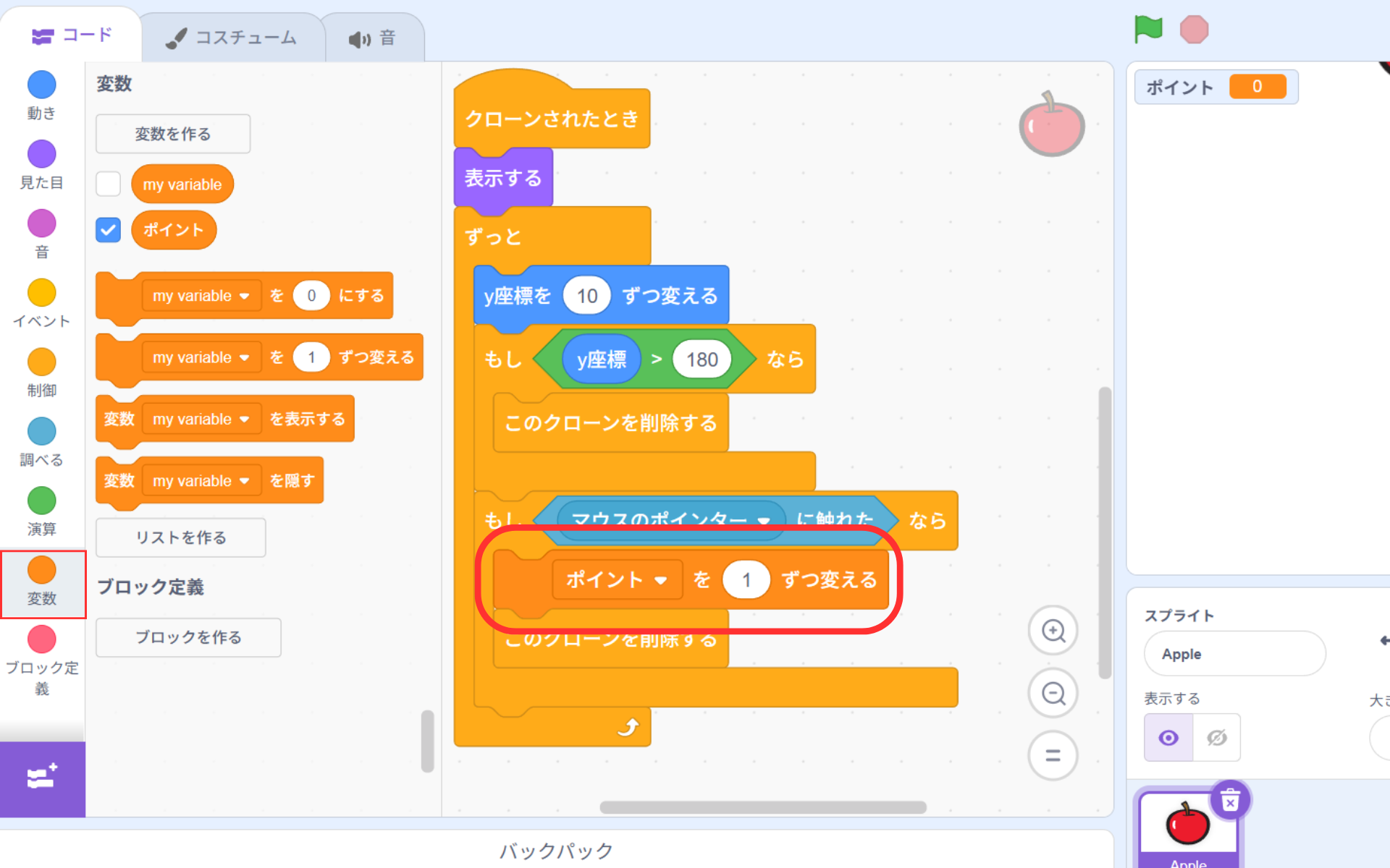 りんごをカットしたときに変数(ポイント)が増えるようにします
