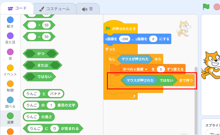 マウスを押している間かべが動きつづけてしまうので、かべが1回動くたびにマウスを離さなければいけないようにします。