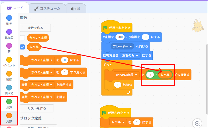 かべのX座標を動かすときにレベルの変数をかけ算します。