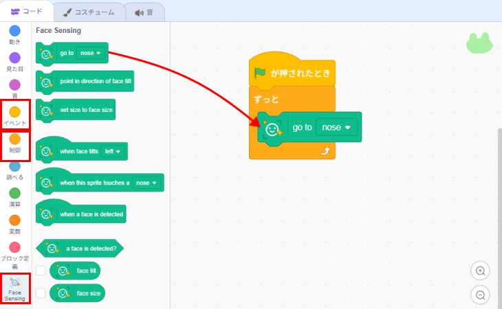 が押されたときずっと鼻(nose)にいくようにします。💡「go to nose」ブロックは鼻に行くという意味です