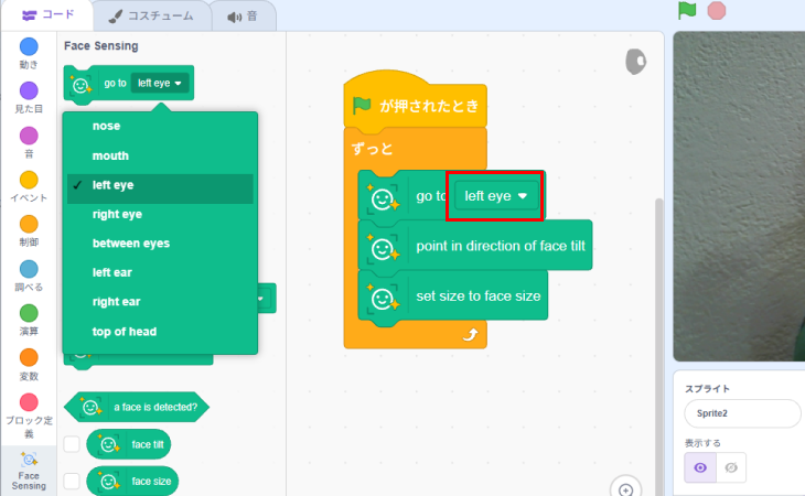 左目のコードをひらいて、あたまと同じように顔認識のブロックを追加します。