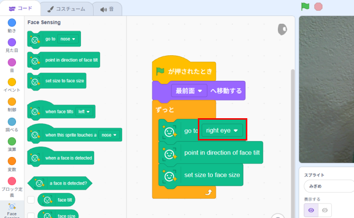 左目(left eye)だったところを右目(right eye)についていくように変えます。