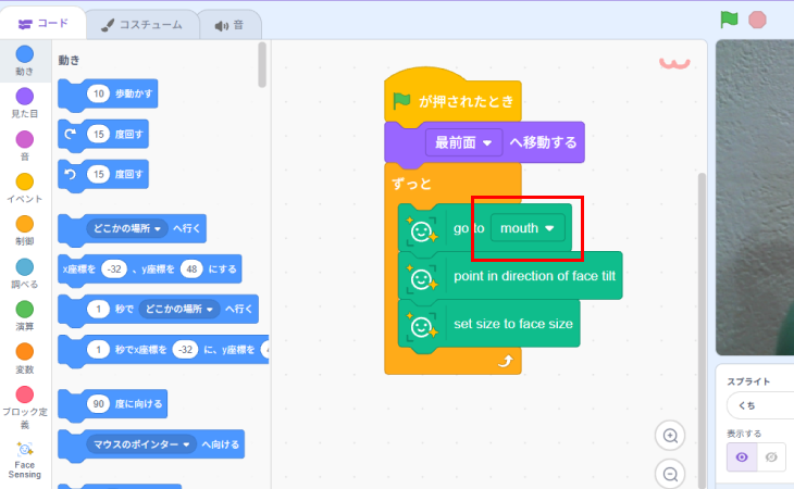 左目(left eye)だったところを口(mouse)についていくように変えます。