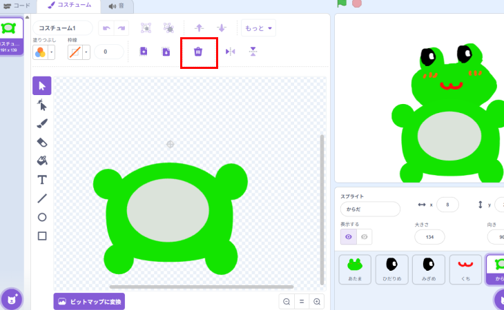 ゴミ箱マークを押して頭の絵を消して、体を描きます。